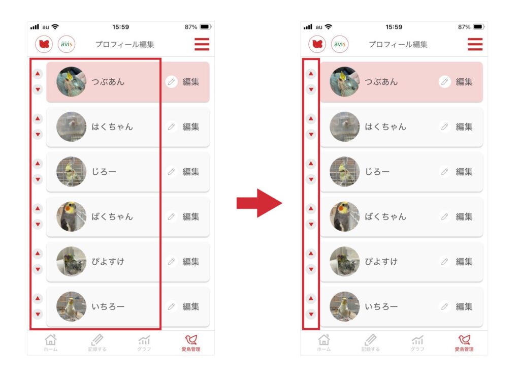 従来は、愛鳥の並び順を変更する際に、「名前部分をドラッグすると並び替えもスクロールも同時に反応してしまう」という声をいただいておりました。